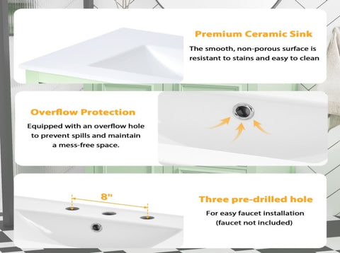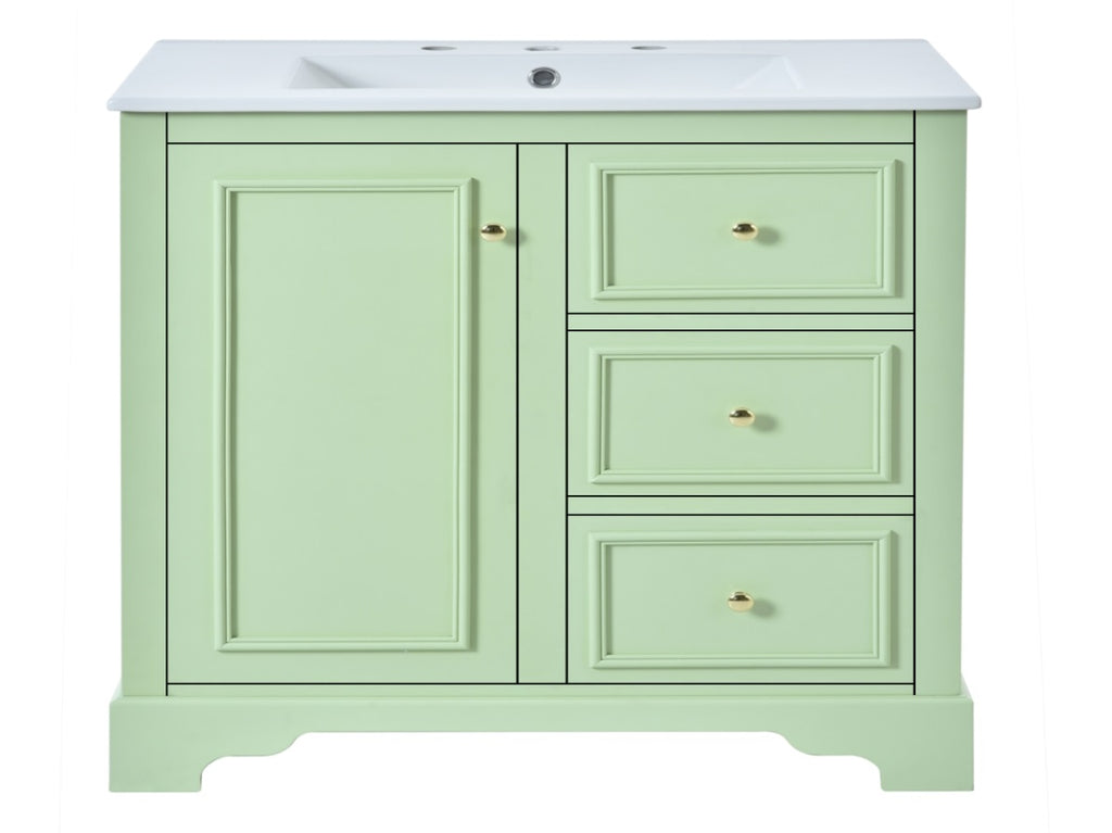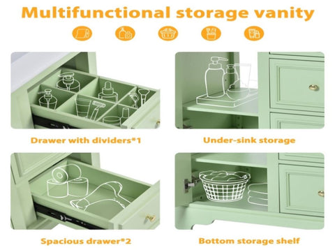 Elevate your bathroom with our exquisite 30-inch green vanity. Featuring delicate golden metal handles and a sleek green finish, this vanity boasts rich storage options with adjustable shelves and three soft-close drawers. The meticulously crafted elegant base exudes sophistication. Imagine the seamless blend of function and elegance as you transform your bathroom into a cozy and comfortable space. Let this stunning vanity be the centerpiece of your bathroom upgrade, offering both beauty and practicality, creating an immersive experience every time you step in.