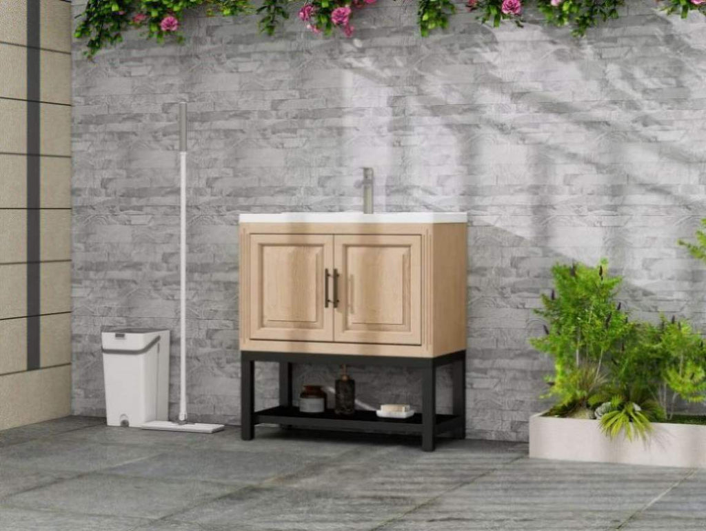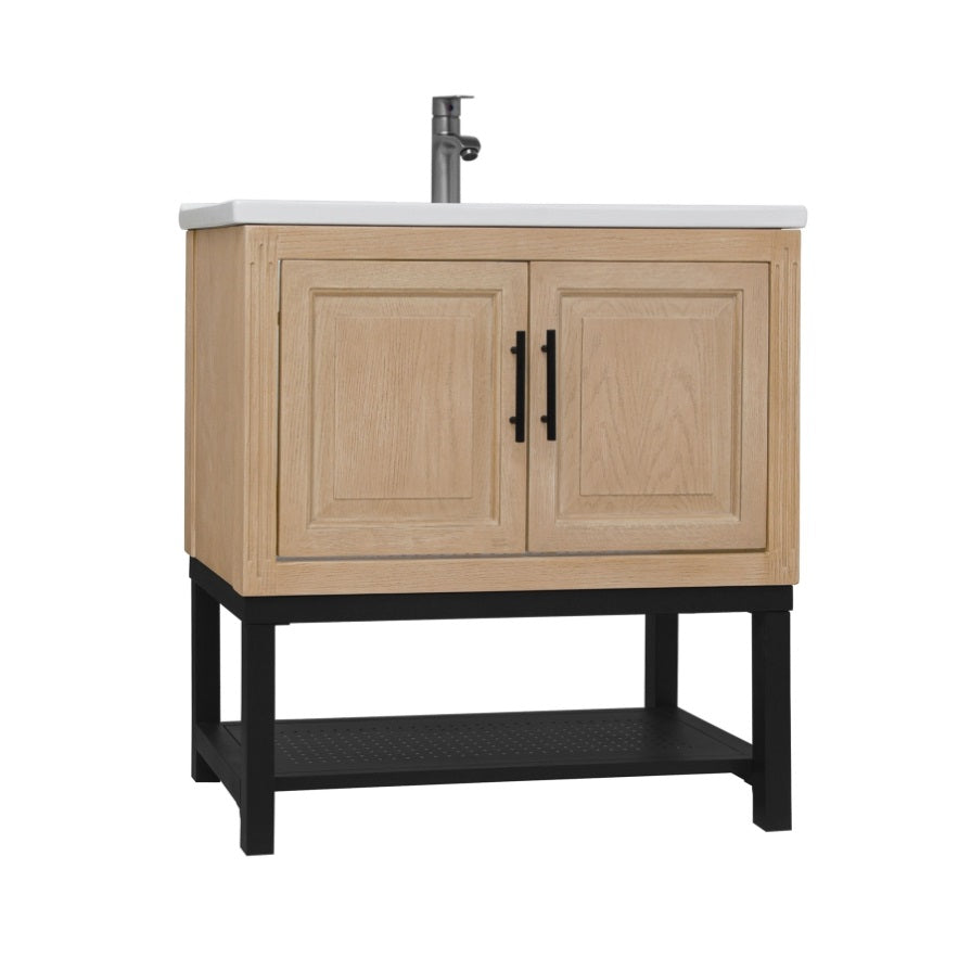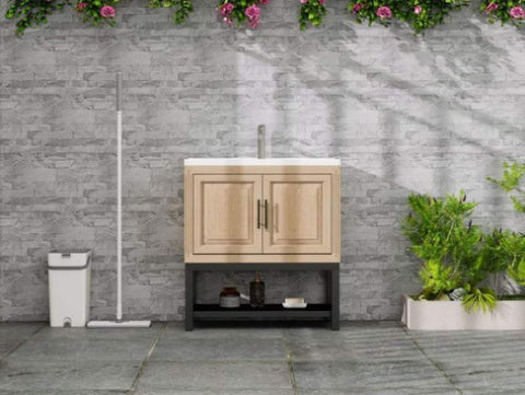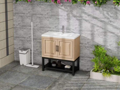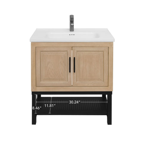 32 inch bathroom cabinet with white ceramic sink, matte aluminum gunmetal hot and cold water faucet, stylish and atmospheric.