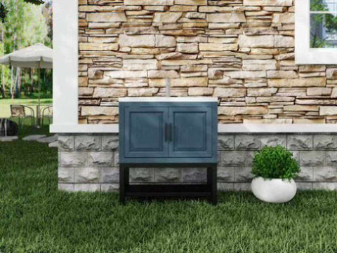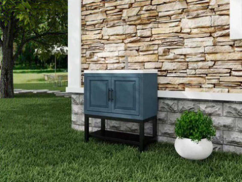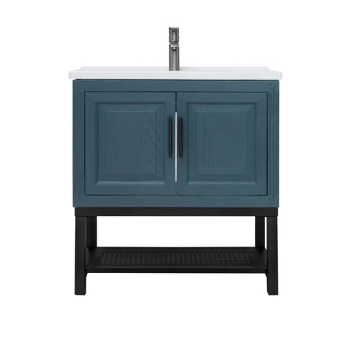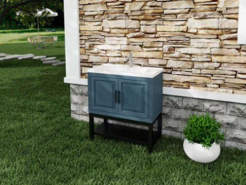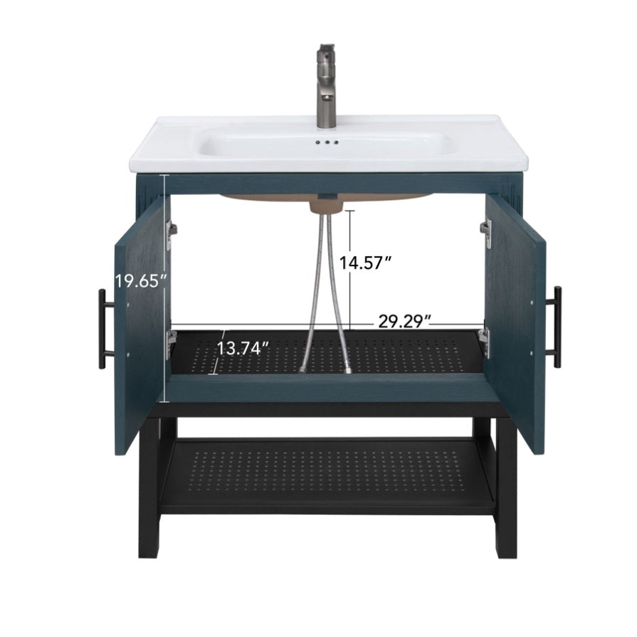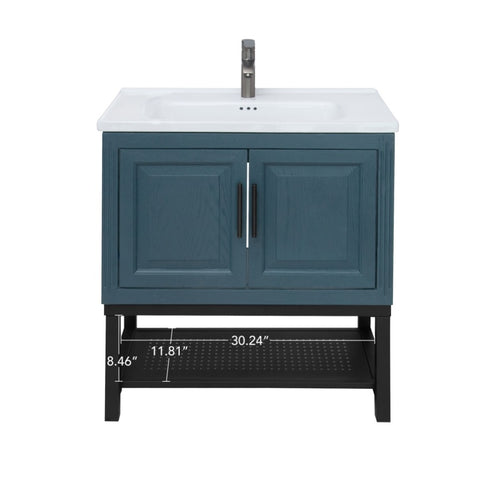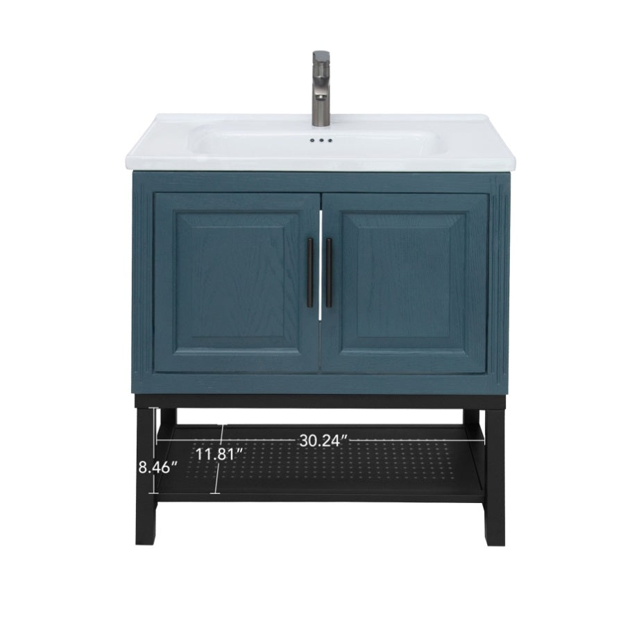 32 inch bathroom cabinet with white ceramic sink, matte aluminum gunmetal hot and cold water faucet, stylish and atmospheric.
