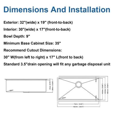 Bonus Accessories: package with 32" x 19" x 9" (fits the minimum cabinet size is 35 inch) undermount stainless steel sink, cutting board, colander, roll up rack, mounting clips, basket strainer drain and bottom grid. Bottom grid protects the sink from scratches or stains caused by heavy pots or pans dropped in and prevents drain be blocked when you place many dishes in the sink. Colander and roll up rack could help you drain water completely after washing and avoid getting wet on the counter