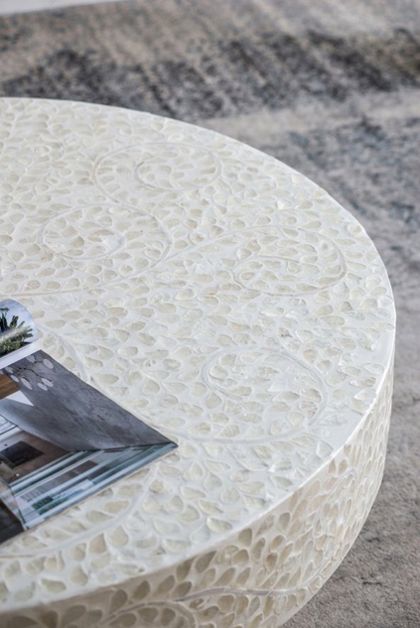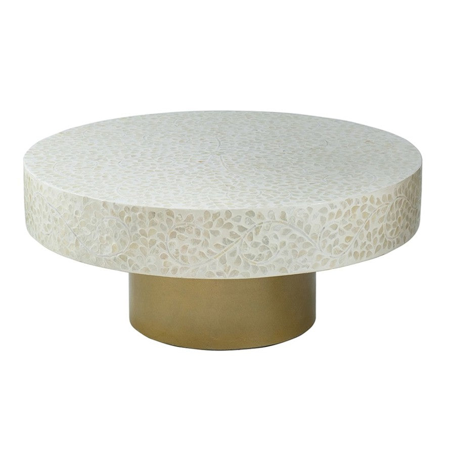 Add drama and functionality to your living room with the Capella coffee table. Crafted in cream it features a gorgeous leafy vine capiz design formed from meticulously inlaid peices and complemented with a pedestal base. Perfect for a luxe retreat or contemporary bohemian room.