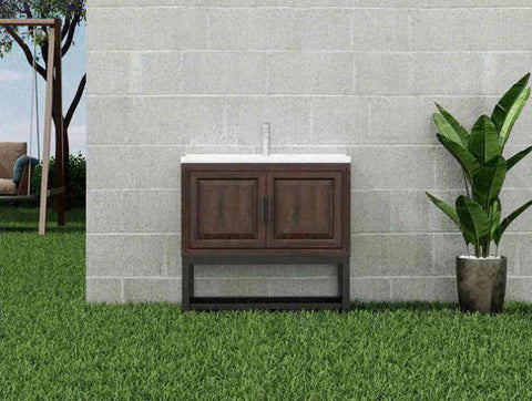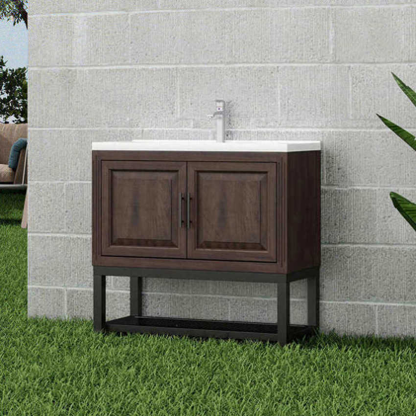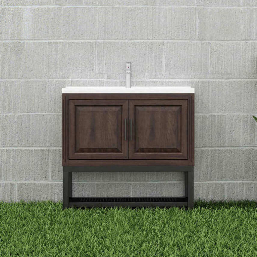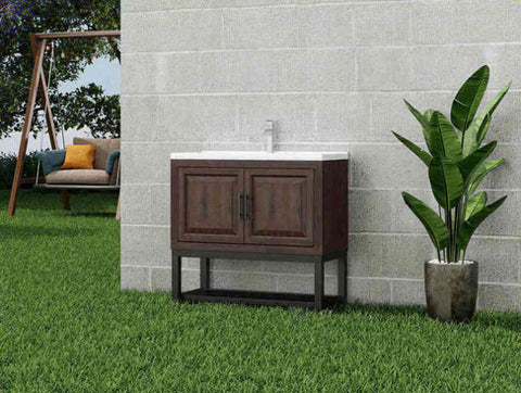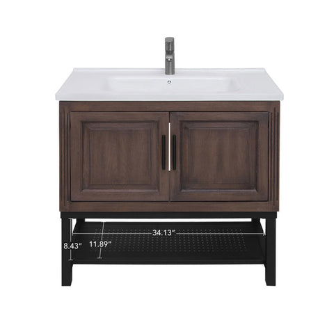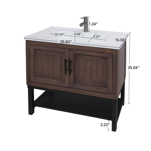 36 inch walnut color bathroom cabinet with white ceramic sink, matte aluminum gunmetal hot and cold water faucet, stylish and atmospheric.