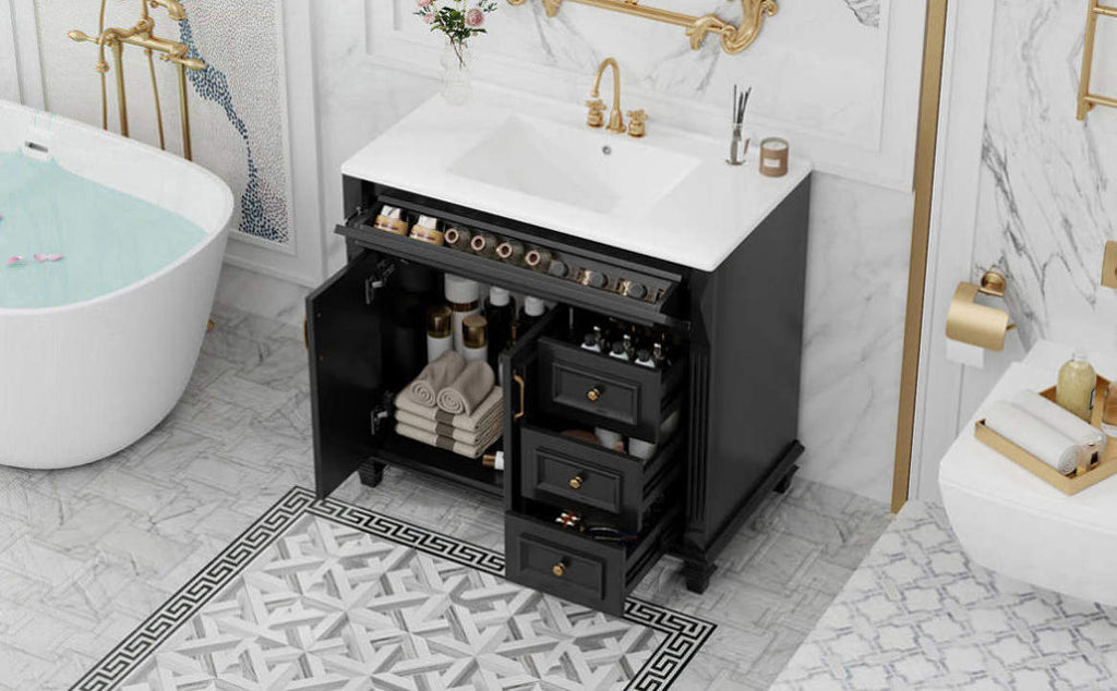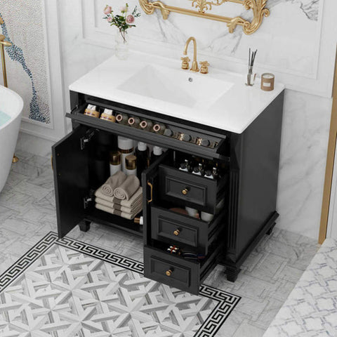 Upgrade your bathroom with this 36-inch freestanding vanity, thoughtfully crafted to combine timeless style, practical storage, and enduring durability. The sleek black finish paired with luxurious gold-tone handles exudes modern sophistication, while the elegantly raised solid wood legs bring a touch of refinement and make floor cleaning effortless. Elegant & Functional Storage Designed for daily convenience and organization, this vanity features: A flip-out top drawer, ideal for storing frequently used items like toothpaste, brushes, or makeup. A spacious cabinet with an adjustable shelf to neatly store towels, bulk toiletries, and larger essentials. A door-mounted storage rack to maximize space and accessibility. Quality Materials & Fine Craftsmanship Constructed from a sturdy solid rubberwood frame and durable MDF, this vanity is built for long-term performance. The smooth black painted surface resists everyday moisture and wear. The cabinet doors are equipped with soft-close hinges for a quiet, gentle closing experience, while the drawers glide smoothly on durable metal tracks. Integrated Ceramic Sink & Hassle-Free Installation Featuring a seamless ceramic sink with a glossy, easy-to-clean surface, this vanity is both stylish and low-maintenance. Pre-drilled faucet holes simplify installation. The freestanding structure complements various bathroom styles—whether modern, classic, or transitional. Why Choose This Vanity ✔ Striking black finish with gold-tone accents ✔ Soft-close cabinet doors & smooth-glide drawers ✔ Solid wood frame with high-quality MDF panels ✔ Spacious and organized interior storage ✔ Integrated ceramic sink with pre-drilled holes ✔ Elegant freestanding design with raised legs With its bold color, premium build, and smart functionality, this 36" black vanity brings elevated style and everyday practicality to your bathroom.