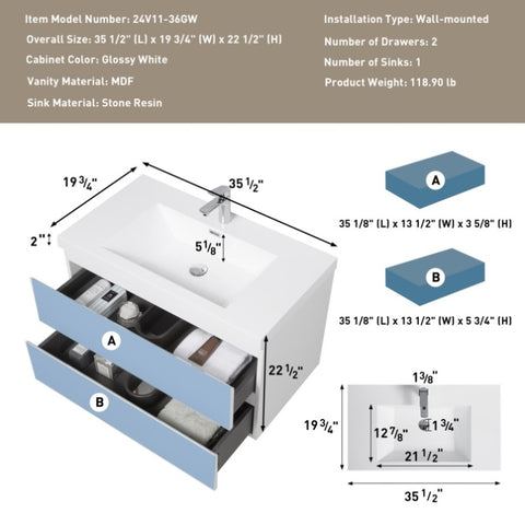 Floating Bathroom Vanity with Sink 24V11-36GW