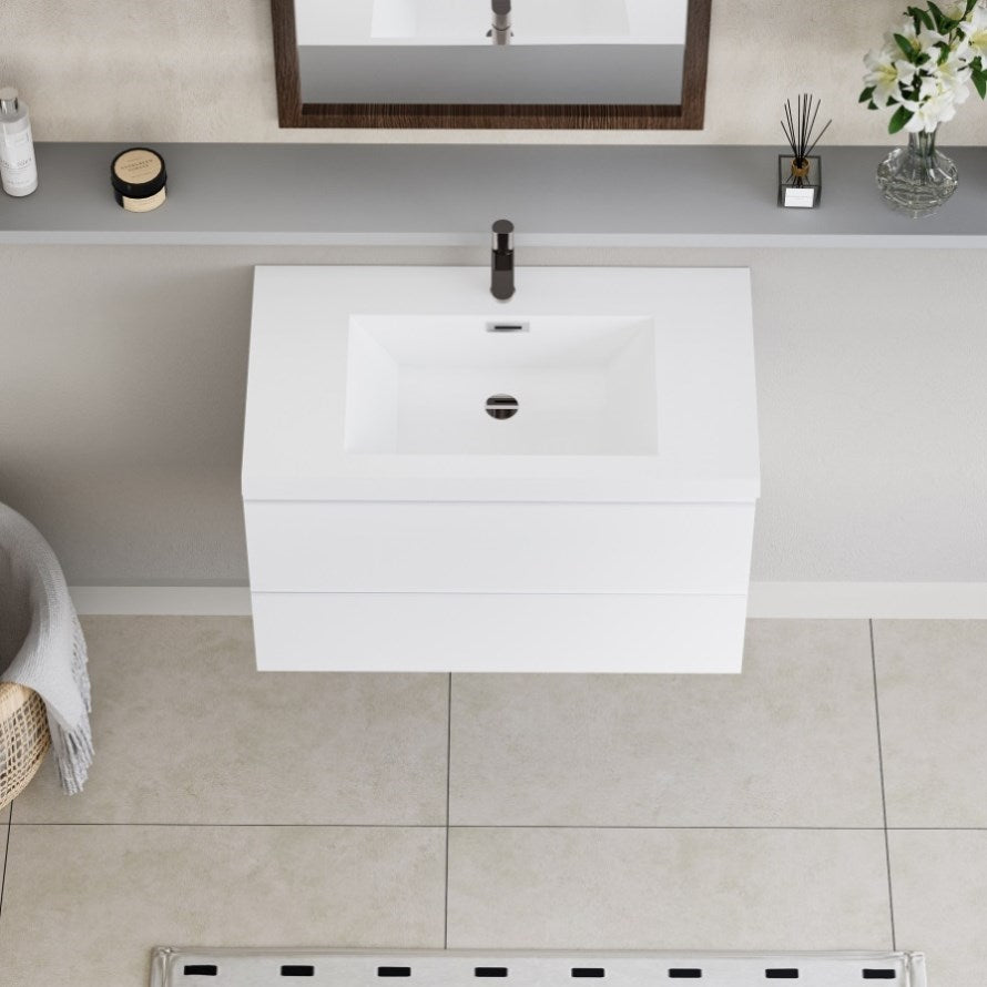 Clean and Functional: Enhance your bathroom with this space-saving, wall-mounted vanity to neatly organize cosmetics and other essentials. Its modern, minimalist design enhances the aesthetics of your space while maximizing functionality.