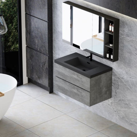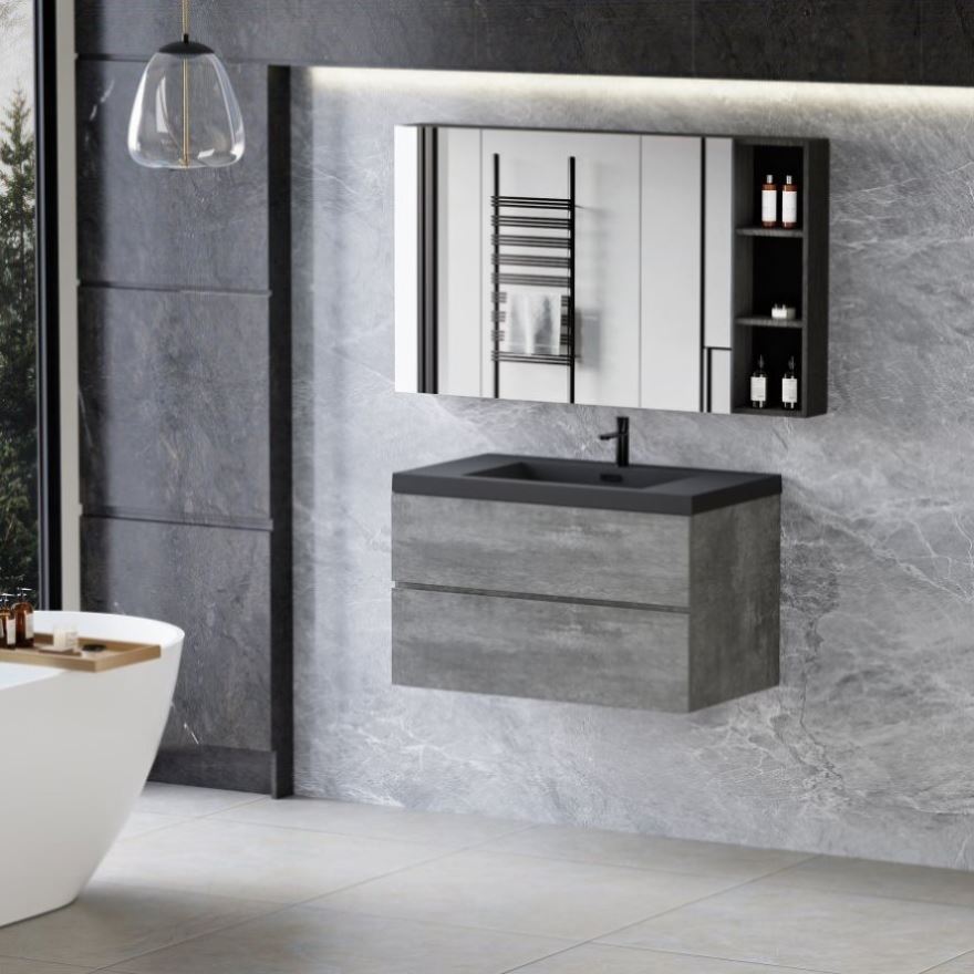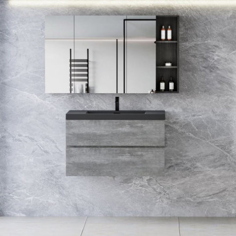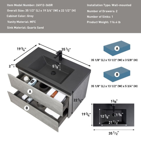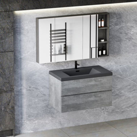 Clean and Functional: Enhance your bathroom with this space-saving, wall-mounted vanity featuring a gray storage cabinet to neatly organize cosmetics and other essentials. Its modern, minimalist design enhances the aesthetics of your space while maximizing functionality.