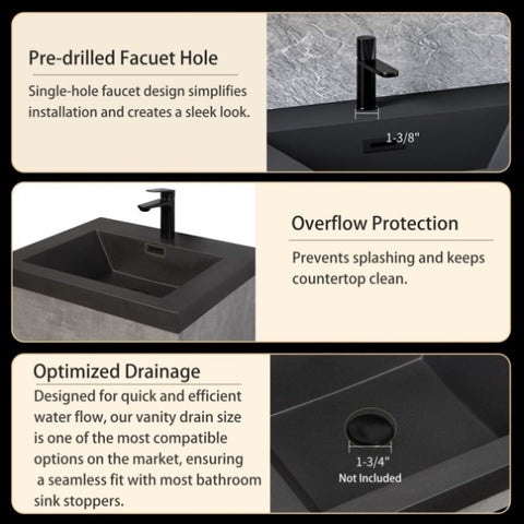 Premium Quartz Sand Sink: Featuring a one-piece, matte black sink made of premium quartz sand, this cabinet sink is easy to clean and resists yellowing with low water absorption. It is compatible with 1-3/8" single hole faucets and 1-3/4" pop-up drains (faucets and drains not included).