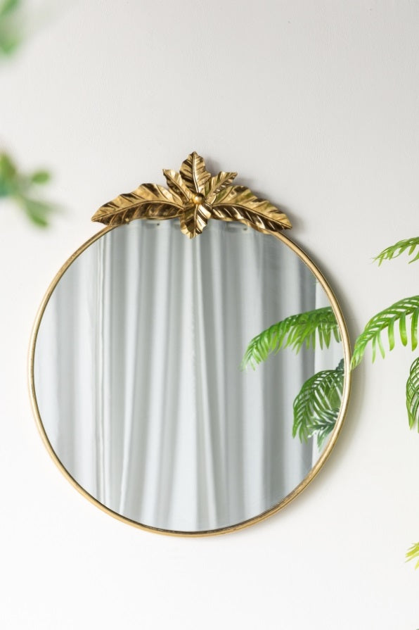 Revitalizing the classic oval silhouette, this accent mirror boasts a clean metal frame that is embellished with a nature-inspired adornment at the head. An ideal size to elevate the decor in your living room, entryway, office, or bedroom, this mirror will thrive as a focal point, with the muted colorway ensuring it will not overwhelm the space. Measurements: 41H x 36W x 2D.