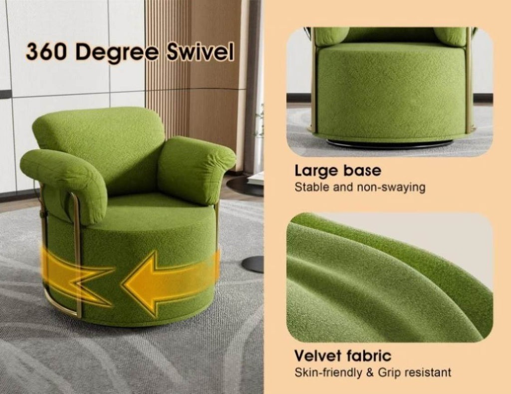 Luxury DesignThis boucle swivel accent chair is made from soft fabric,skin-friendly, scratch-resistant, easy to clean,providing better comfort.With a gold metal frame, very stylish and elegant.