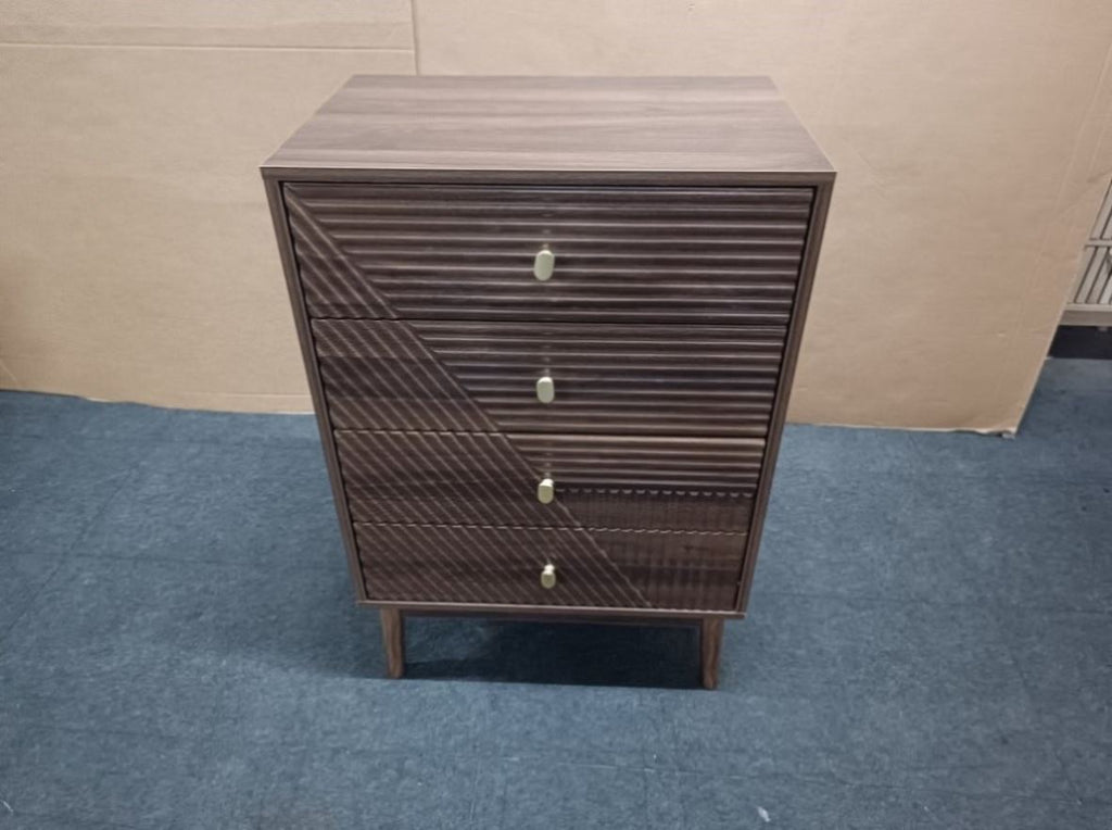 Unique DesignThis 4-drawer cabinet is made with special craftsmanship, the panel adopts line collision design, metal knobs and solid wood legs. The mid-century modern style design adds a unique fashion style to your home.