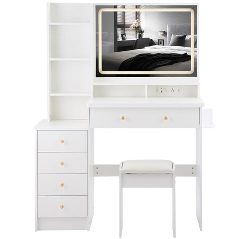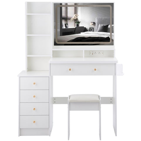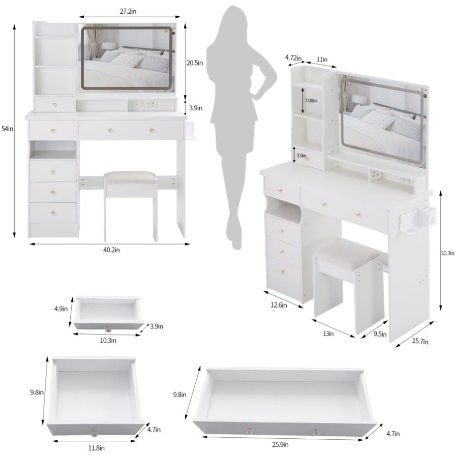 [41" length, equipped with a 27"x20" vanity mirror]: The length of the vanity table is 41", the width is 15.7", and the height is 54", equipped with a 27"x20" vanity mirror. It has a very large countertop and ultra-high storage capacity, suitable for adult use. It requires a lot of space.