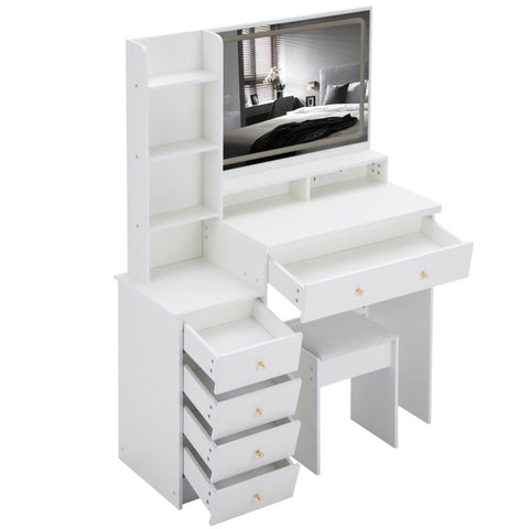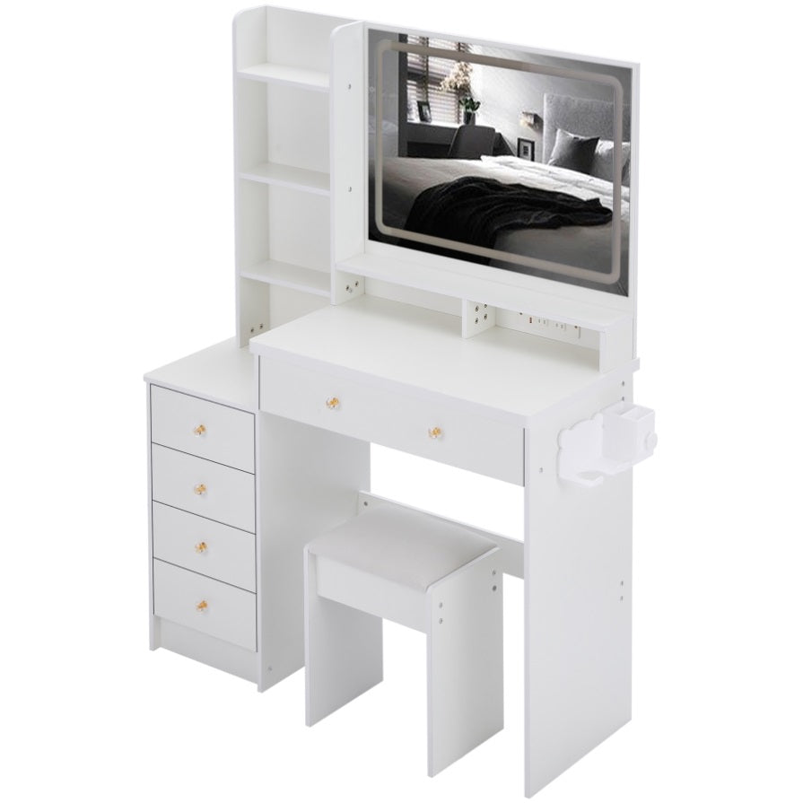Introduction:  This product was designed by outstanding graduates from the renowned Parsons School of Design in New York, and has won an award in the American Fast Fashion Home Design Competition. It has been granted design patent protection in the United States. Certified by EPA, GCC, and UL.   Including:  1 x dressing table 1 x dressing stool 1 x Installation instructions
