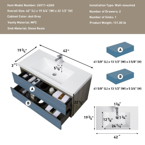 42" Floating Bathroom Vanity with Sink (24V11-42AG)