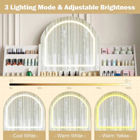 3 Color Lighting Modes: The white dressing table with light has LED lights in three colors with adjustable brightness to suit various makeup scenarios, such as dinner makeup, date makeup or office makeup.