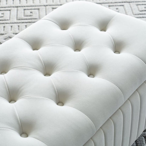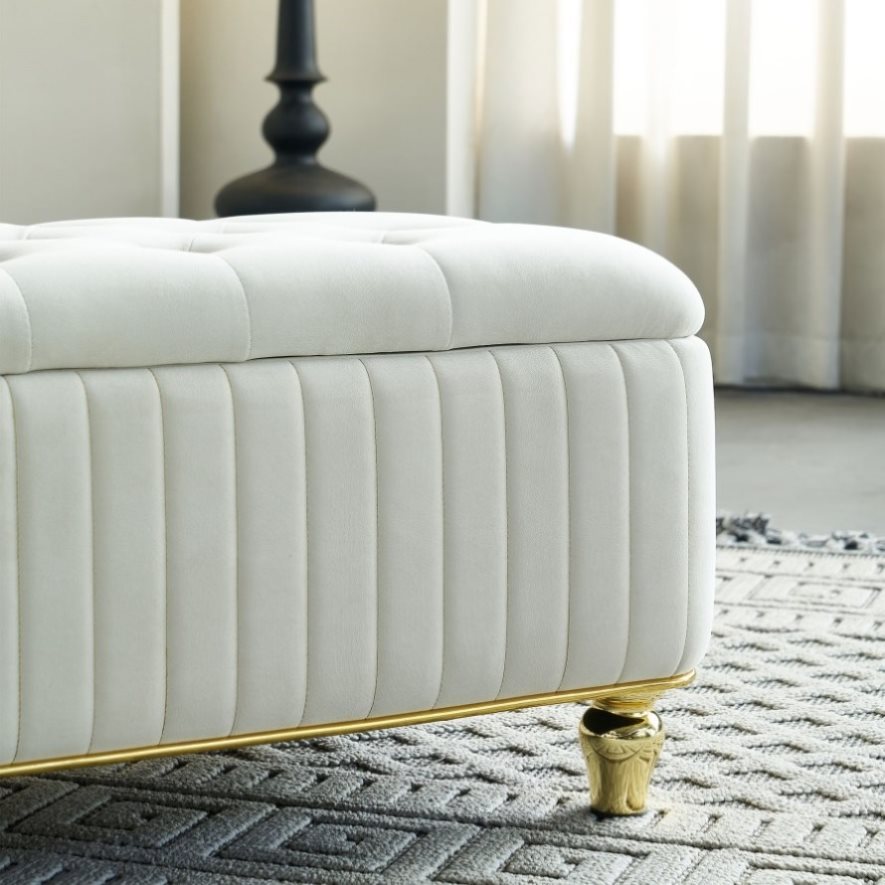 The ottoman is decorated with golden strip and deep button tufting that adds a more modern glam style to your living room or bedroom