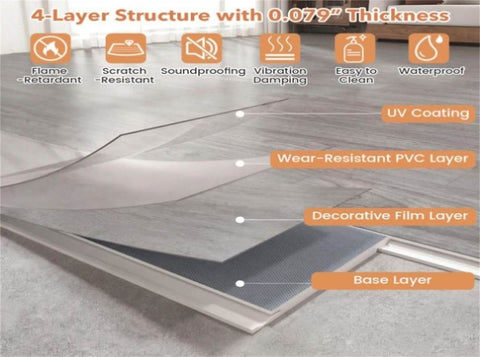 • Spill Shield for Busy Rooms: The 24-pack vinyl plank flooring features a 4-layer structure with 0.079" thickness. Its waterproof performance keeps the surface stable against everyday spills, while simplifying daily cleanup.