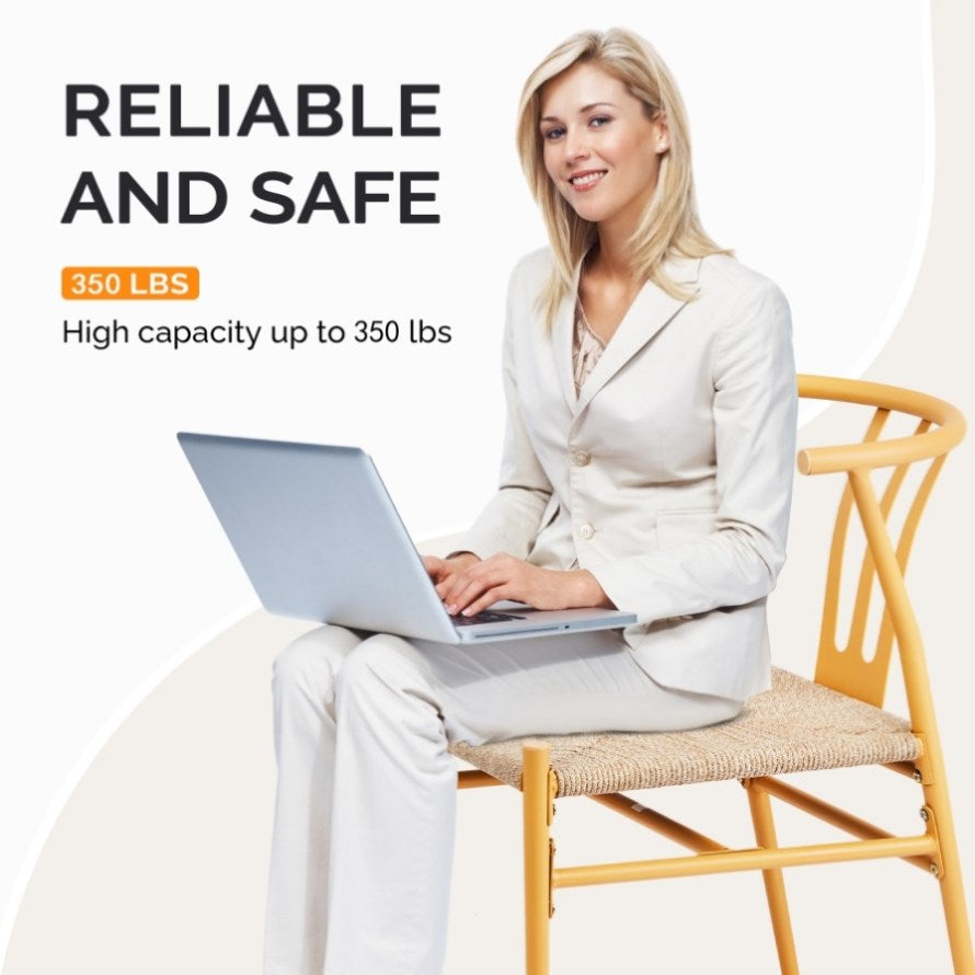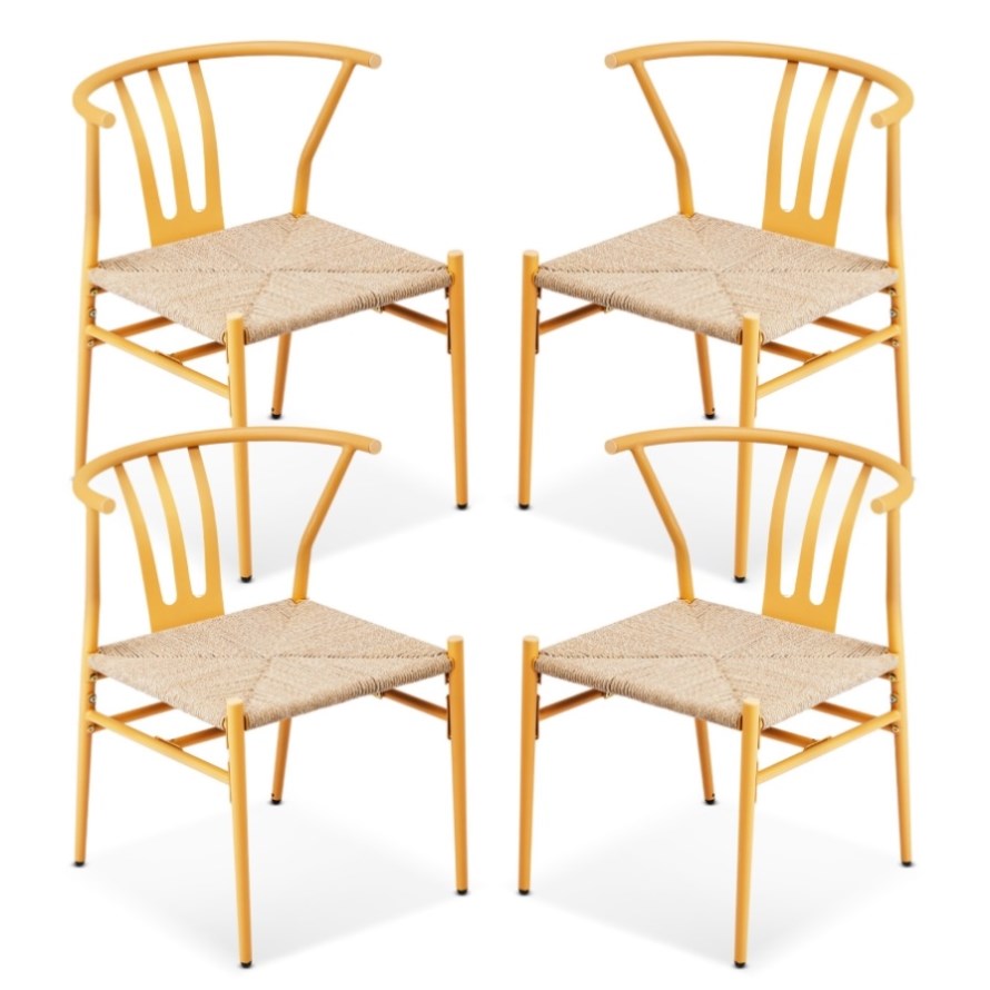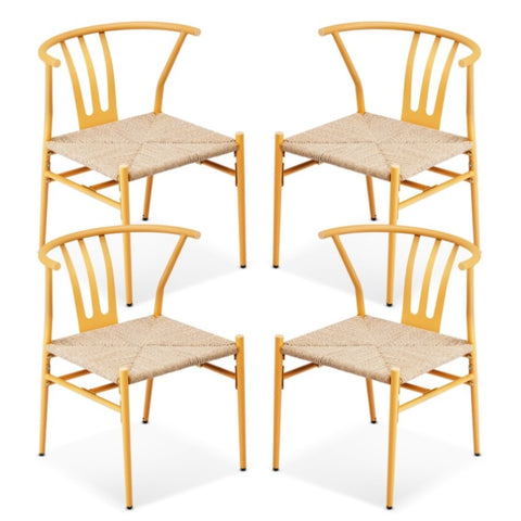 Enhance your dining experience with this set of 4 beautifully designed Weave Dining Chairs. Combining mid-century modern aesthetics with comfort, these chairs feature a cozy woven seat crafted from natural hand-woven rope, offering both softness and durability. The wraparound backrest and armrest provide excellent upper body support, ensuring comfort even during extended sitting. Perfect for your kitchen, dining room, or living room, these chairs are designed to seamlessly blend into any decor, while adjustable foot pads ensure stability on uneven floors. Crafted with a sturdy metal frame, these chairs offer both style and lasting durability.