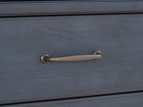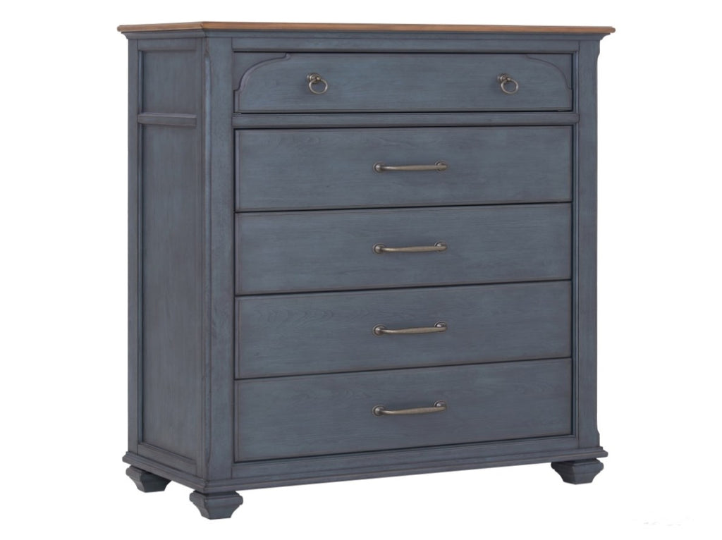This Chest boasts a refreshing coastal twist on traditional style. Skillfully crafted from Rubberwood Solids and Birch Veneers, the subtle distressing Corduroy Blue finish and Antique Pewter hardware give this Chest an updated look with a timeless heirloom feel. Featuring five drawers with felt lined top drawer, this Chest will provide ample storage space for clothing and accessories. Just like Baseball, Apple Pie and Rock & Roll, this Chest of Drawers will become a beloved favorite in your home. Fully assembled upon arrival, this piece is ready to unbox and enjoy