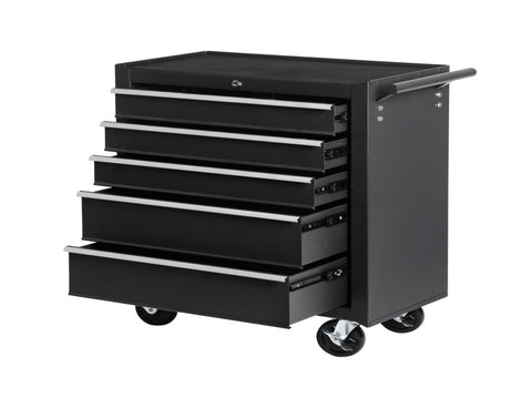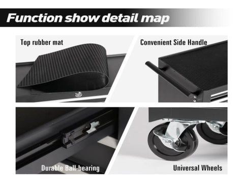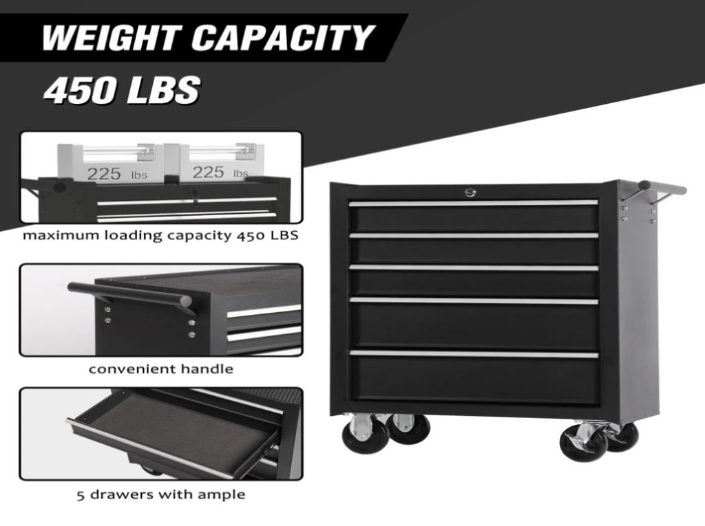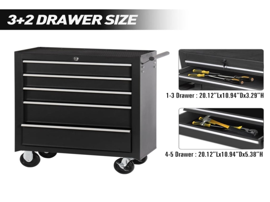 - FAIR STORAGE SPACE: The rolling tool chest is designed with 5 drawers for storing tools, small equipment or other objects. And its top, with a cushion, can be used for placing tools during work as well.