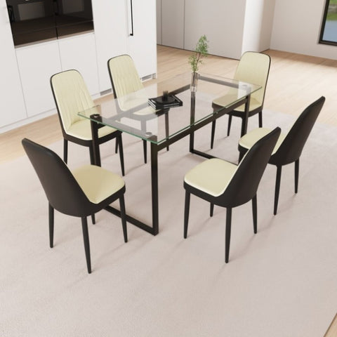 - 7.【Modern dining table set】 This 7-piece kitchen table set includes a modern square glass dining table and 6 high-quality PU upholstered dining chairs. The modern industrial design of the dining table and chairs features clean lines that blend well into a variety of decorative styles. the spacious 51" square tabletop is spacious enough to easily accommodate 6 people in a small apartment.