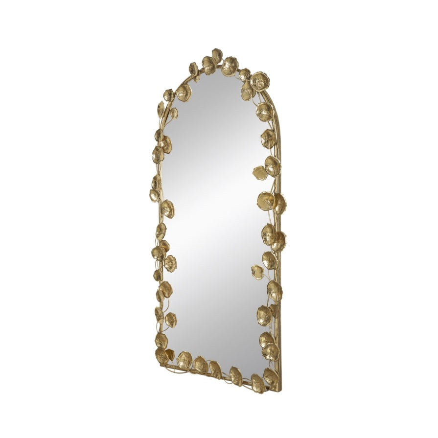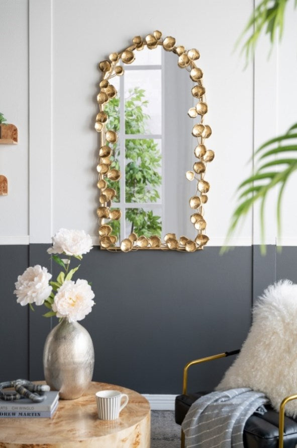With its grand arched silhouette, solid iron construction, and playful golden leaf accents, this full-length decorative mirror will infuse your space with an eye-catching whimsy. Measuring a large 51H x 29W x 2.5D, it will easily capture your whole reflection while also adding a burst of fun to your daily routine.