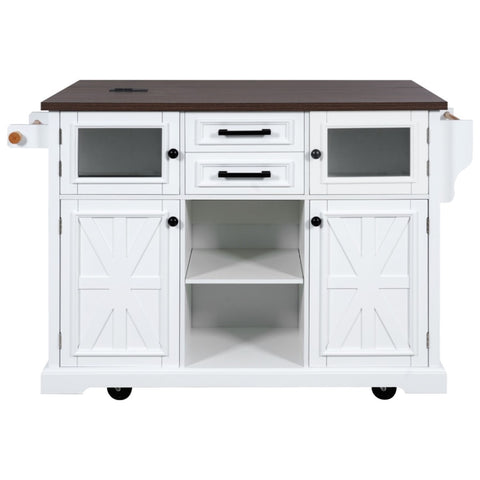 Summary:Introducing our 54.9-inch wide, beautifully and elegantly designed farmhouse kitchen island, a perfect fusion of embossed texture, cross-barn panel, and visual glass door that brings a touch of rustic charm to your home. With its spacious design and durable construction, this island is not just a statement piece but also a practical addition to any dining room or kitchen area. This large kitchen island contains 2-tier door interior storage rack for spices and jars. Power outlets and towel racks on the same side add another level of functionality. Crafted from rubber wood table and high-quality MDF and rubber wood side pillar, it offers ample storage (2 drawers and 4 cabinets) for your kitchen essentials while blending seamlessly with a variety of interior styles, from farmhouse to modern.