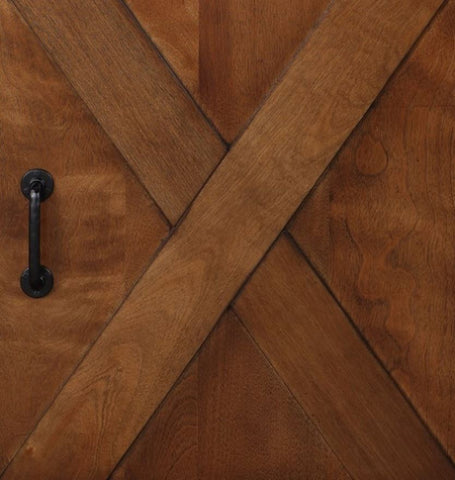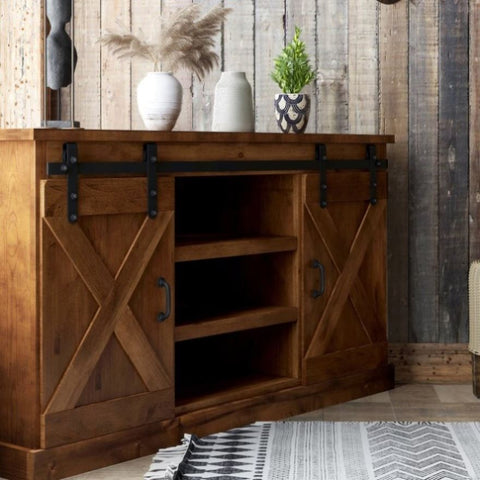 This Farmhouse 56 inch Corner TV Stand is steeped in age-old tradition and style. Expertly crafted from the finest sustainable Knotty Alder Solids and Veneers, this Corner entertainment center is finished in a rich Aged Whiskey and accented with matte black, forged iron hardware. Featuring a space-saving design, rustic, X-style farmhouse sliding barn doors and 5 shelves, this Corner TV Console will accommodate TVs up to 65 inches and provide ample storage for media and gaming consoles and home décor favorites. Cable management openings on the back panel will keep your cords and wires concealed. Fully assembled upon arrival, this piece is ready to unbox and enjoy. Bring home this high-quality TV Console for a beautiful addition to your modern farmhouse decor.
