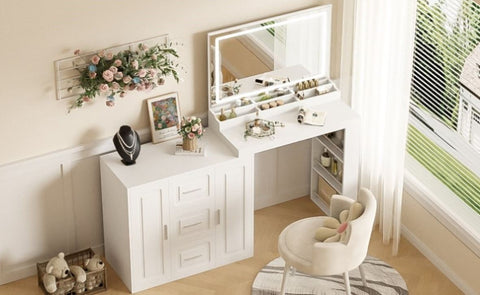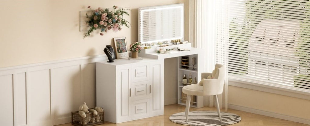 Ample Storage Space: Designed with organization in mind, this dressing table features 3 spacious drawers and 2 cabinets with adjustable shelves in three heights to store your beauty essentials, skincare products, and other personal items. Keeping everything organized and within easy reach is the perfect addition to your daily routine.