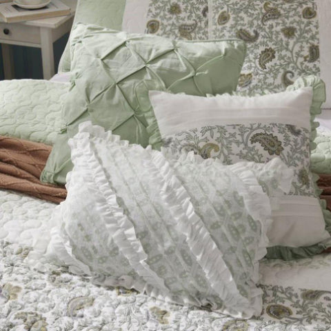 6-Piece Quilt Set Includes 1 floral quilt, 2 shams, and 3 decorative pillows with pleating and ruching, perfect to complement farmhouse or cottage-style bedding.