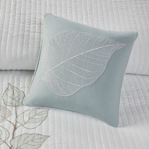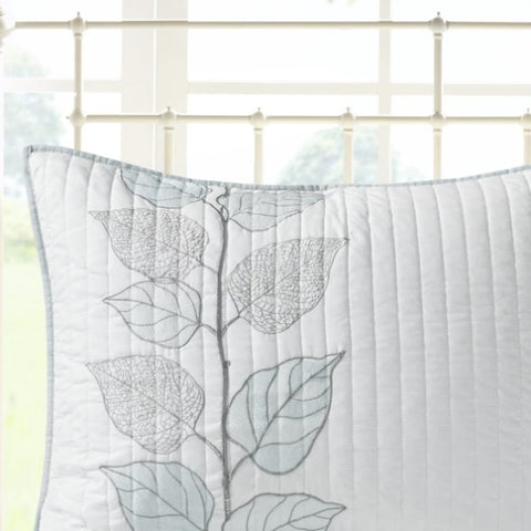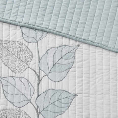 This beautiful 6 Piece Reversible quilt set is a classic stylish look with an embroidered leaf print. Caelie is blue and white with subtle stripes that add texture. The quilt reverses to a soft blue. With a microfiber polyester face and a brushed fabric reverse, this quilt is soft to the touch and machine washable for easy care. Two matching standard shams and three embroidered decorative pillows complete the look. Queen size features two rows of embroidery, King size features three rows. Items in the set may come in a rolled or compressed packaging, which will need to be fluffed up or steam ironed before use to remove wrinkles.