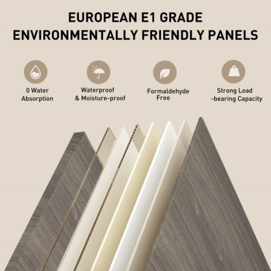 Made of eco-friendly board that is water resistant, formaldehyde free, safe, and provides excellent load support.