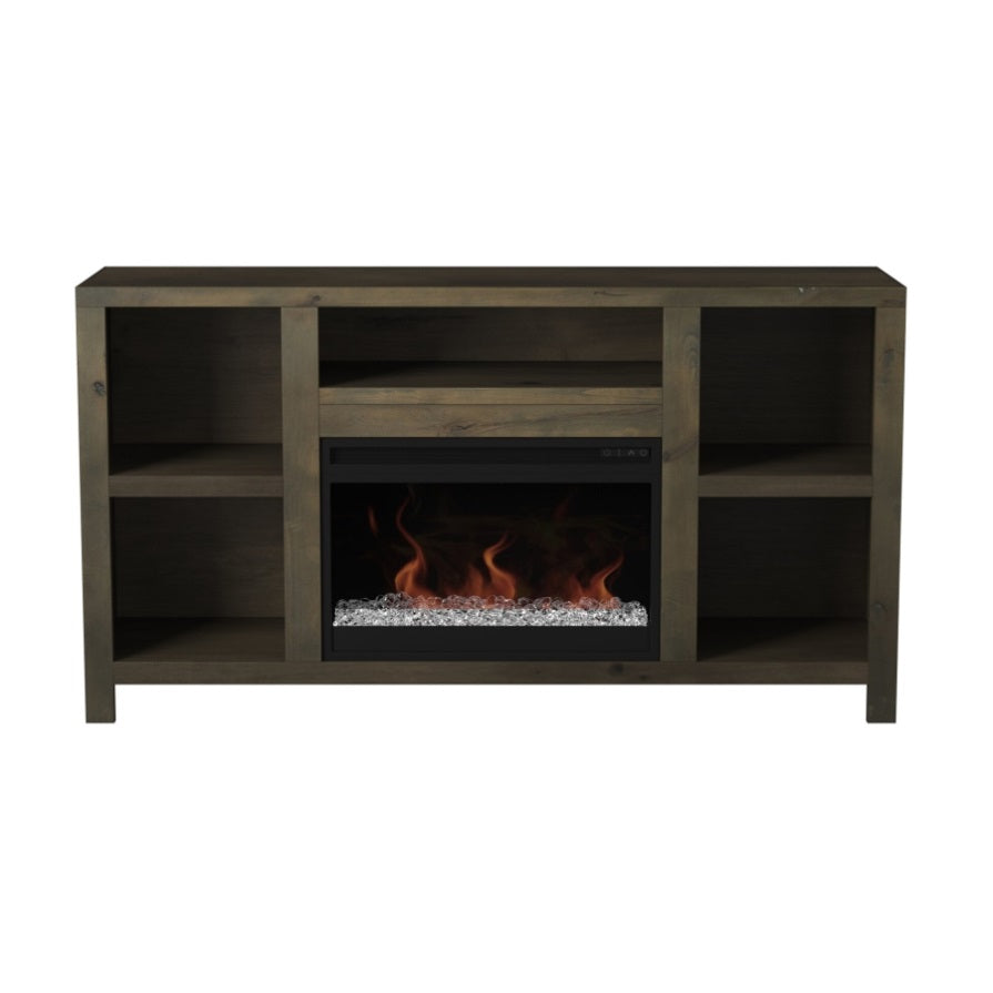 This 62 inch Electric Fireplace TV Stand Console boasts a striking and modern take on rustic charm. Skillfully crafted from Knotty Alder solids and veneers, this fireplace entertainment center is finished in a rich Barnwood with classic hammered Bronze hardware. Featuring three shelves, this fireplace TV Stand will accommodate TVs up to 70 inches and provide ample storage for media and gaming consoles and home décor favorites. Cable management openings on the back panel will keep your cords and wires concealed. The 26 inch electric fireplace insert includes a remote control and multiple settings allow for heat up to 400 square feet. Four (included) screws make securing the fireplace insert to the console quick and simple. Bring home this high-quality TV Console for a picturesque upgrade in your living room or bedroom.
