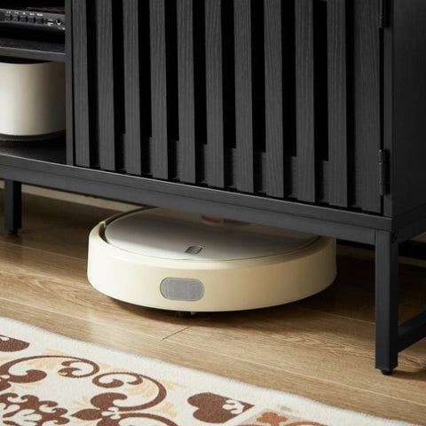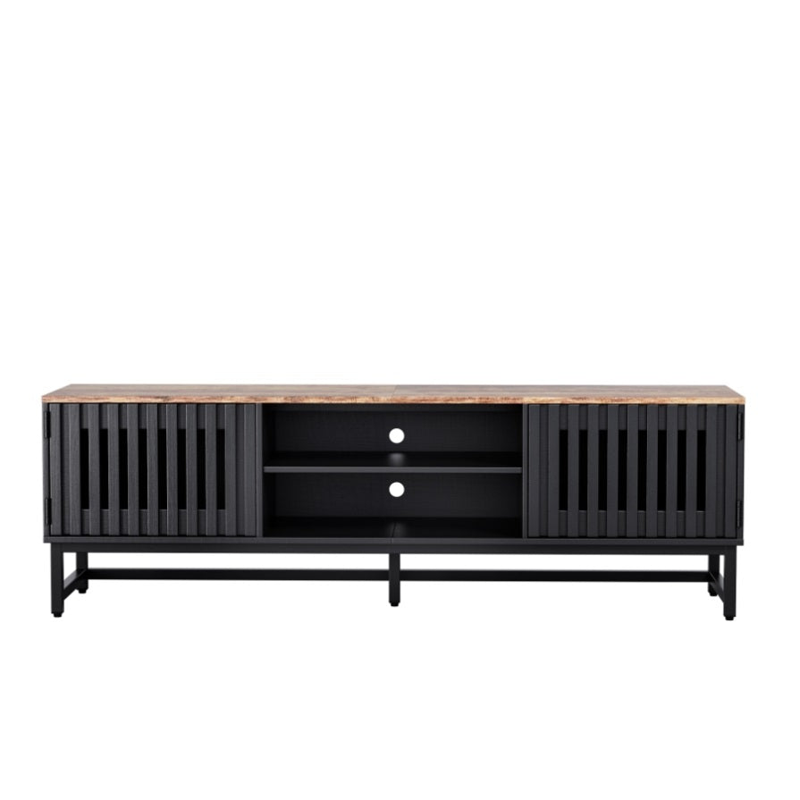 The Black TV stand with Grille striped doors, bringing an eye-catching design to your living room or dining room.