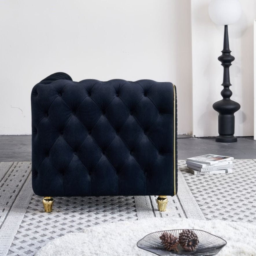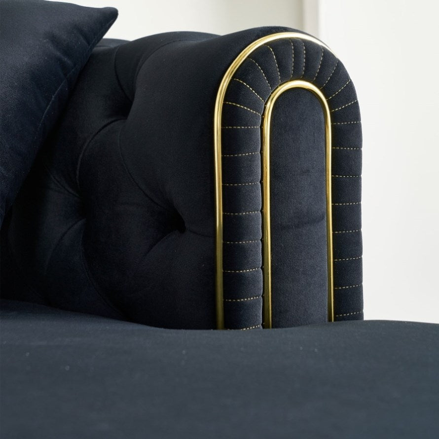 This tufted back sofa features gold strip trim and deep button tufting that adds classic glam style to your living room.