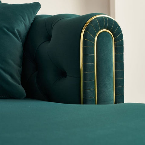 This tufted back sofa features gold strip trim and deep button tufting that adds classic glam style to your living room.