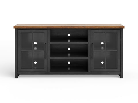 This 67 inch TV Stand Console delivers a flawless combination of modern farmhouse style and country simplicity. Beautifully crafted from Poplar Solids, Okoume Veneers and Knotty Alder, this Entertainment Center features a two-tone Black and Whiskey finish and oil-rubbed Bronze hardware. Ideal for TVs up to 80 inches, this TV Console includes two glass windowpane doors, four shelves and cable management on the back panel for media and gaming console storage. Fully assembled upon arrival, this piece is ready to unbox and enjoy.