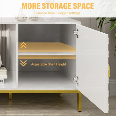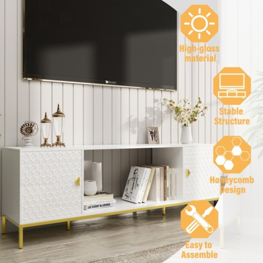 This electric fireplace TV cabinet in our store is equipped with ample storage space and a luxurious and elegant honeycomb appearance, paired with charming golden tapered legs and triangular handles. After opening the door panel, it contains an adjustable shelf that can be adjusted and stored to keep the living room tidy