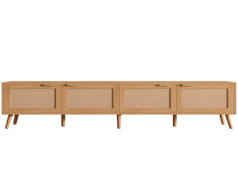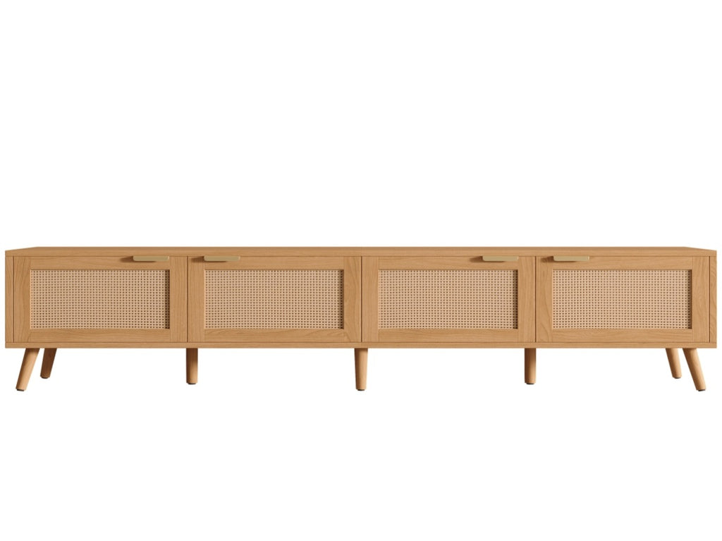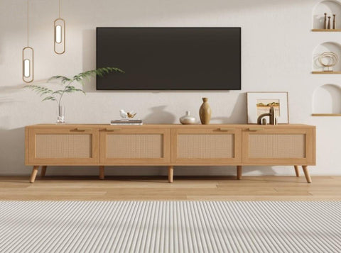This TV stand masterfully combines generous storage with elegant design to serve as the centerpiece of your entertainment area. Its spacious interior is perfectly suited for housing an 80-inch television alongside your media players and gaming consoles, while the distinctive rattan doors introduce natural texture to your decor. Practical features like integrated cable holes ensure effortless wire management, and the solid-wood legs provide unwavering stability. With a robust top capable of supporting 110 lbs, this unit delivers both enduring style and dependable function for your home.
