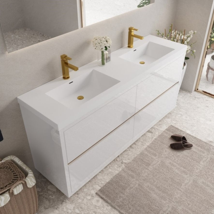 Premium Stone Resin Countertop: It features a glossy white, one-piece sink made of high-quality materials that are easy to clean, resist yellowing, and have low water absorption.