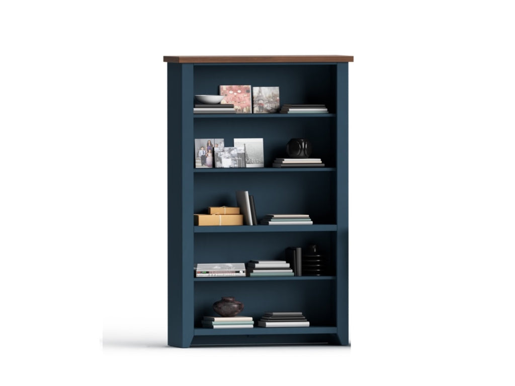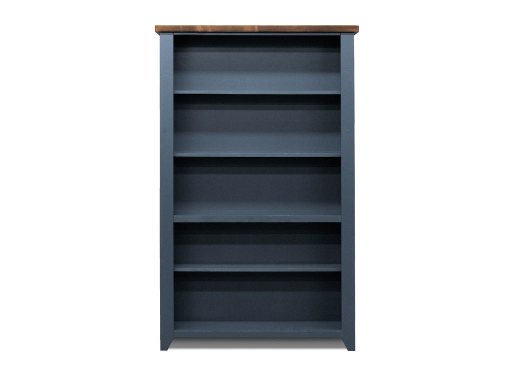 This 72 inch high bookcase delivers a flawless combination of modern farmhouse style and country simplicity. Beautifully crafted from Poplar Solids, Okoume Veneers and Knotty Alder, this bookshelf features a two-tone Blue Denim and Whiskey finish and five shelves. Ideal for storing office essentials or showcasing your book collection and home décor, this versatile bookcase will be a charming addition to any room in your home. Fully assembled upon arrival, this bookshelf is ready to unbox and enjoy.