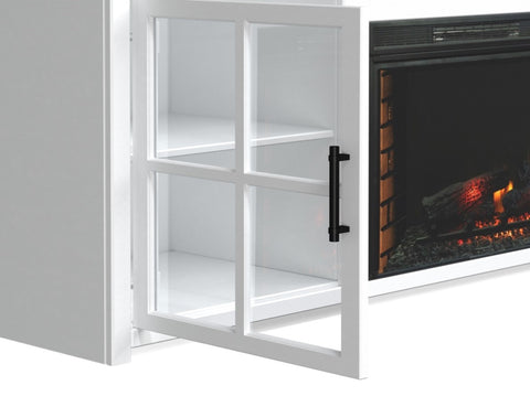 This 74 inch Fireplace TV Stand Console delivers a flawless combination of modern farmhouse style and country simplicity. Beautifully crafted from Poplar Solids, Okoume Veneers and Knotty Alder, this Fireplace Entertainment Center features a two-tone Jasmine Whitewash and Barnwood finish and oil-rubbed Bronze hardware. Ideal for TVs up to 85 inches, this Fireplace TV Stand includes two glass windowpane doors, three shelves and cable management on the back panel for media and gaming console storage. The 28 inch electric fireplace insert includes a remote control and multiple settings allow for heat up to 400 square feet. Four (included) screws make securing the fireplace insert to the console quick and simple.