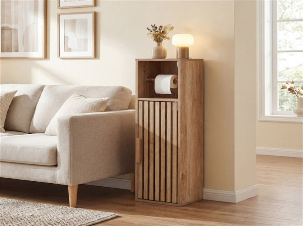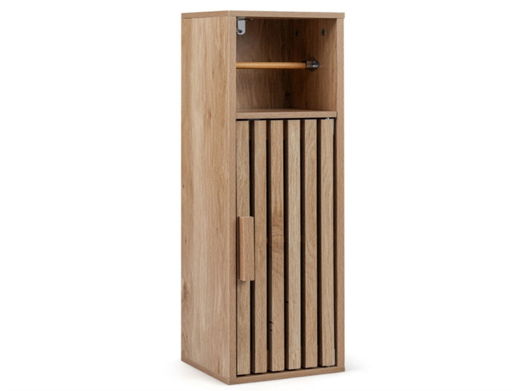 • Fresh-Looking Design: Featuring a slat-door design, this slim bathroom cabinet promotes airflow to keep items fresher. Its natural tones add calm, spa-like warmth to bathrooms, laundry rooms, and living areas and blends easily with your existing style.