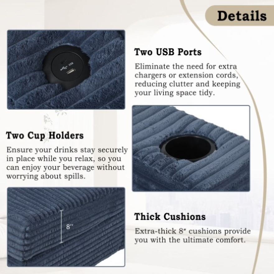 86.5" Oversized Loveseat Chaise Lounge Sectional Sofa Bed Corduroy Sleeper Sofa with USB Ports , N719P232602C