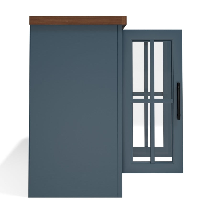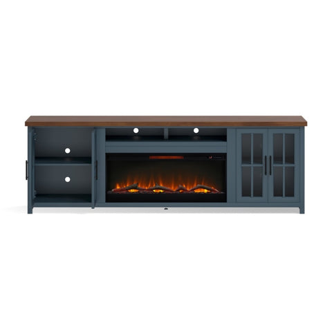This 97 inch Fireplace TV Stand Console delivers a flawless combination of modern farmhouse style and country simplicity. Beautifully crafted from Poplar Solids, Okoume Veneers and Knotty Alder, this Fireplace Entertainment Center features a two-tone Blue Denim and Whiskey finish and oil-rubbed Bronze hardware. Ideal for TVs up to 100 inches, this Fireplace TV Stand includes four glass windowpane doors, three shelves and cable management on the back panel for media and gaming console storage. The 42 inch electric fireplace insert includes a remote control and multiple settings allow for heat up to 400 square feet. Four (included) screws make securing the fireplace insert to the console quick and simple.
