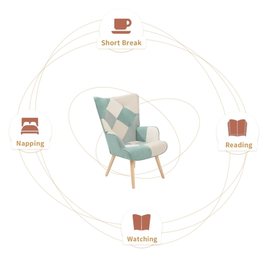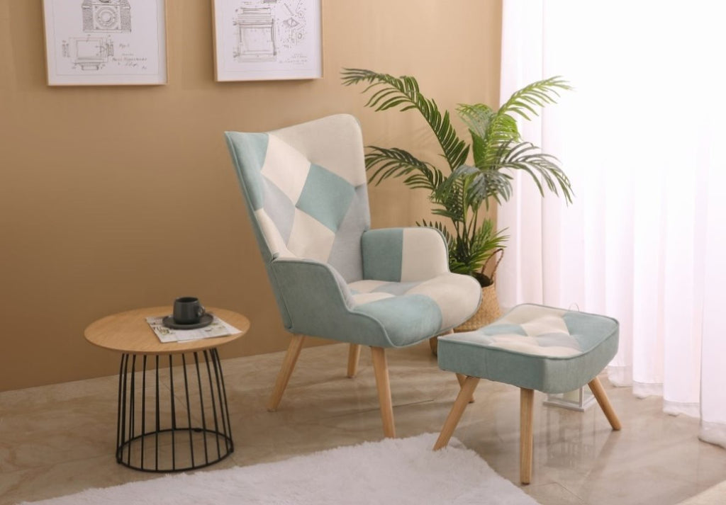 This accent chair with ottoman set has a creative splicing cloth surface and curved tall back. It’s the design makes it eye-catching and beautiful, compared with other chairs. Otherwise, the armchair also can be used as home decoration
