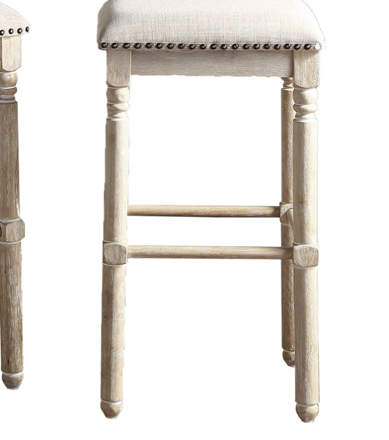 Relax at your bar on the Arnhem Wood Tan Upholstered Swivel Barstool's comfortably foam-padded seat. This charming barstool has an open, airy structure without a back or arms to clutter up its clean, inviting silhouette. The stool features a rubberwood frame with a white-washed finish in a natural brown tone. The seat is upholstered with light tan fabric, trimmed with bronze nailhead.