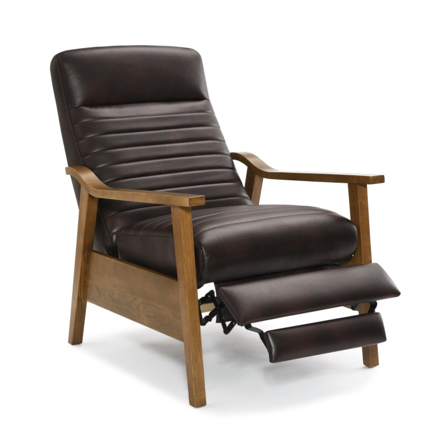 Transform your living space with our exquisite Asher Wood Arm Push Back Recliner. The exposed wood frame is finished in a light Ash brown while the channel stitched seat and back add an extra touch of refinement and comfort. Recline and unwind with this simple, manual push back design.