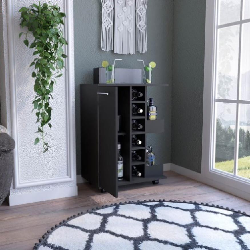 Bar Cart, Two External Shelves, Four Casters, Six Built-in Wine Rack, Single Door Cabinet -Black B07091824