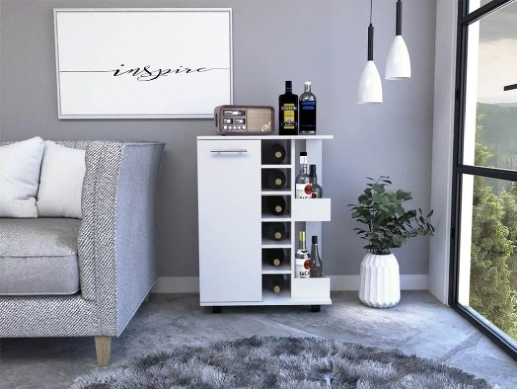 Bar Cart, Two External Shelves, Four Casters, Six Built-in Wine Rack, Single Door Cabinet -White B20091830