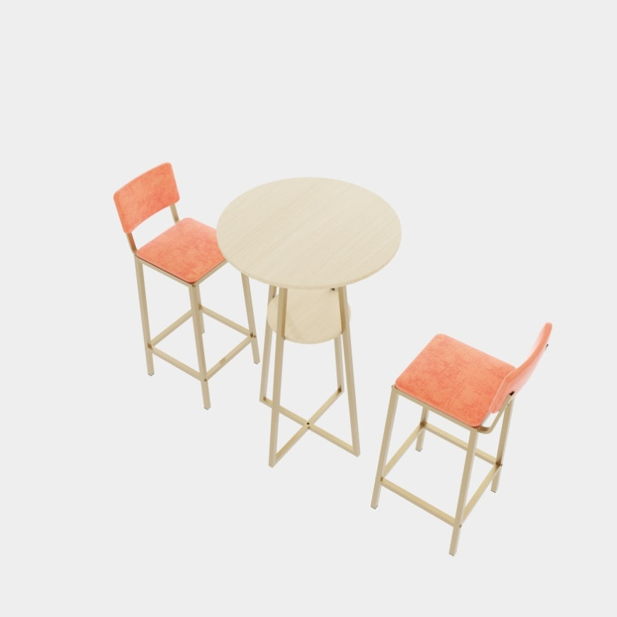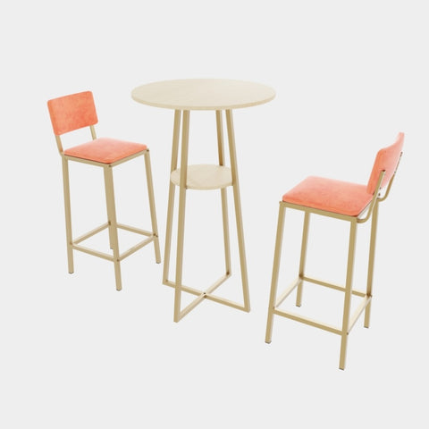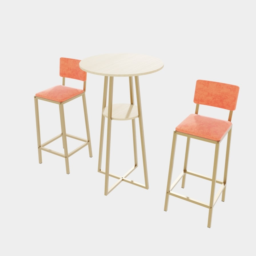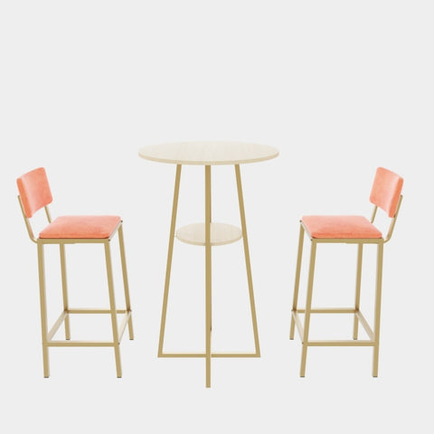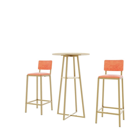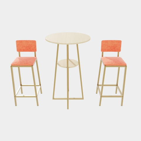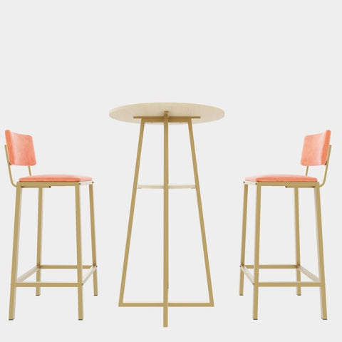 This three piece set of bar tables and chairs features an elegant design and beautiful appearance. The golden frame is paired with sponge cushions and backrests, making it perfect for placing in various styles of spaces such as dining rooms, living rooms, bedrooms, balconies, courtyards, etc
